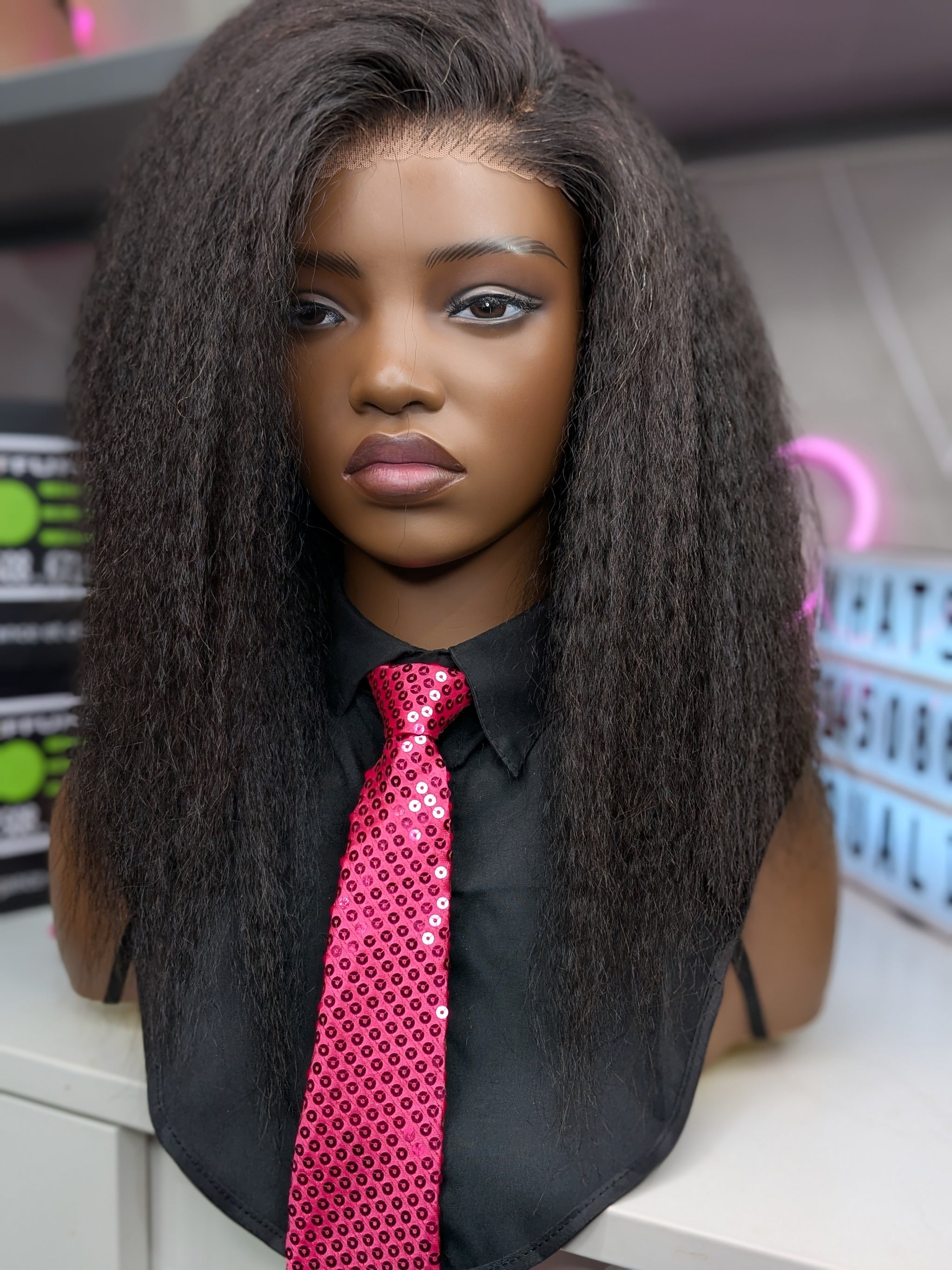 Voici « Kinky Straight Sans Colle 14 pouces ». Une perruque de 14 pouces avec texture kinky straight et installation sans colle. Pour celles qui veulent un look naturel texturé avec un confort maximal.