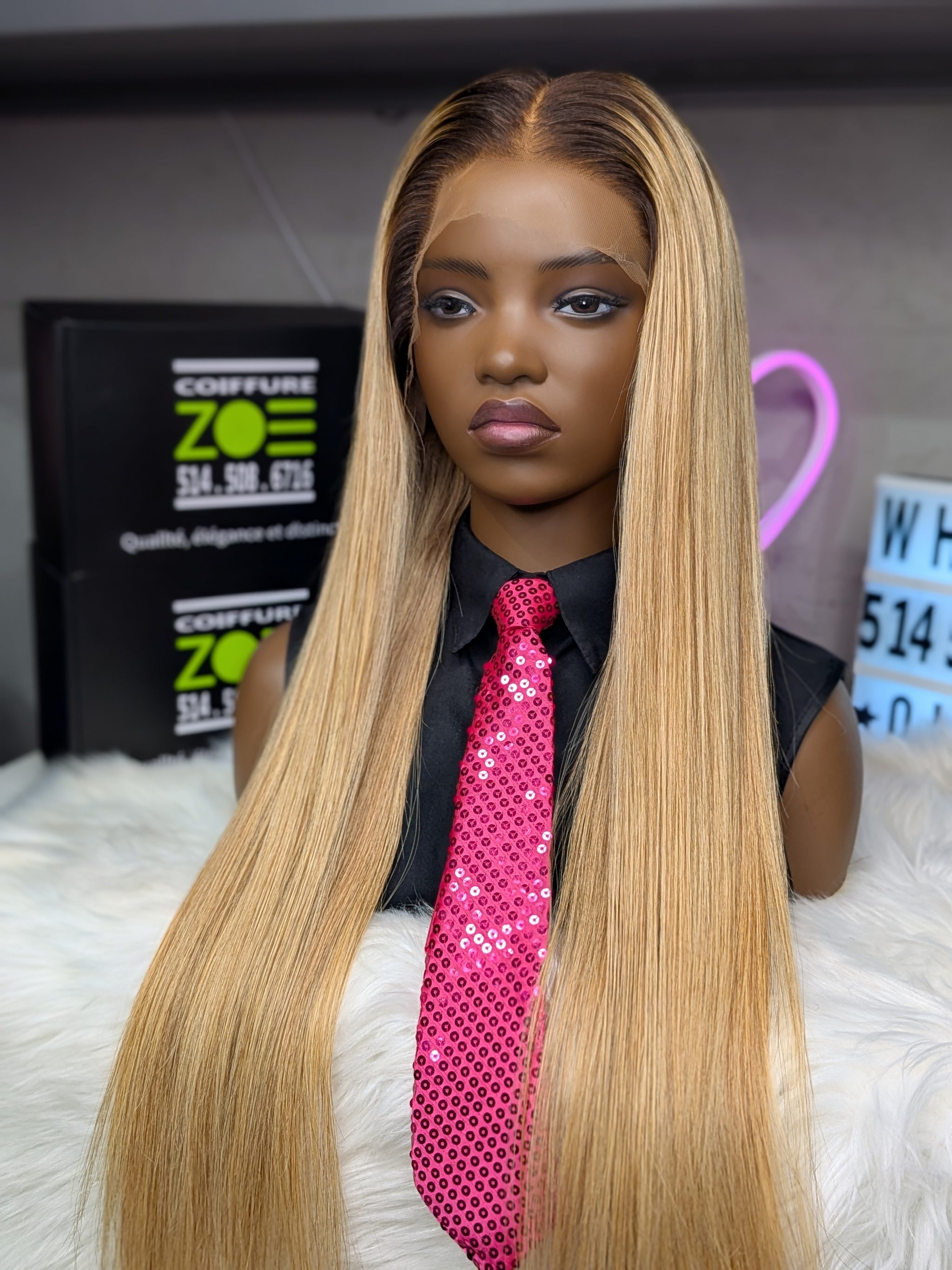 Cheveux Virgin Hair d'une qualité exceptionnelle. Doux au toucher, brillance naturelle, mouvement fluide. 28 pouces de pure élégance blonde.